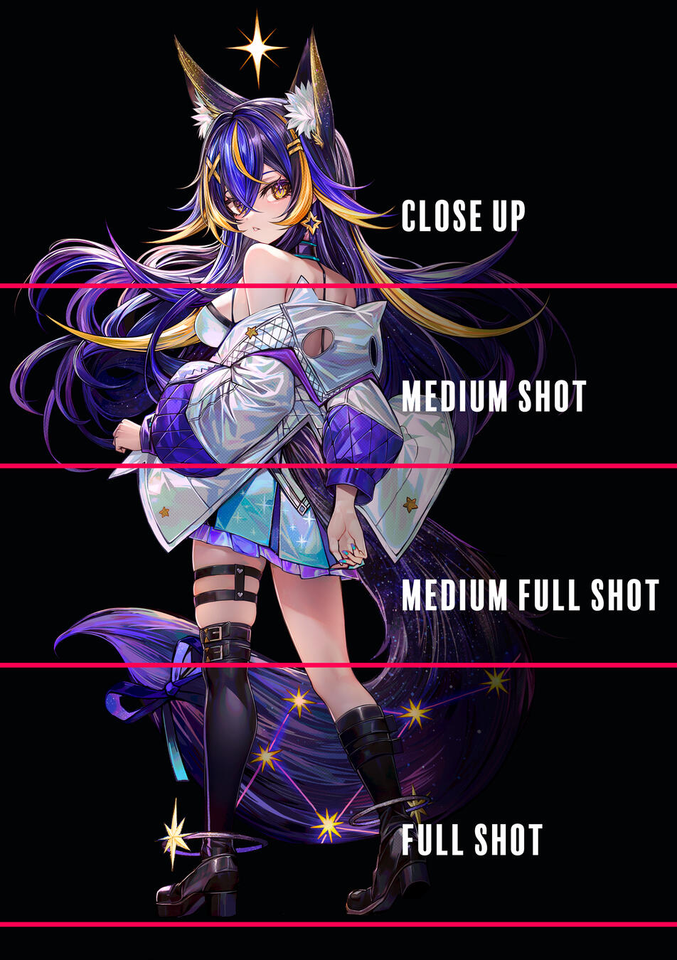 依頼のスケール:クロース・ショット / ミディアム・ショット / フルミディアム・ショット / フル・ショット